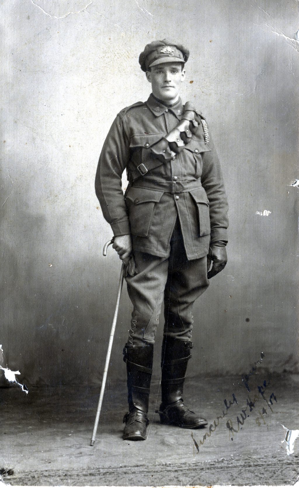 1917.My father in leather riding leggings and the 5-pouch ammunition bandolier across his shoulder – standard dress for an ammunition column driver. Walking stick and gloves were part of the props for studio photos.